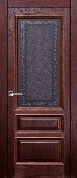 Классическая дубовая дверь Аристократ 2 в тонированном покрытии махагон с защитным полиуретановым лаком, со стеклом в цвете графит с наплавом. За счет применения в конструкции обвязки из массива ольхи, цена на межкомнатную дверь будет меньше чем за полноценный дубовый массив.