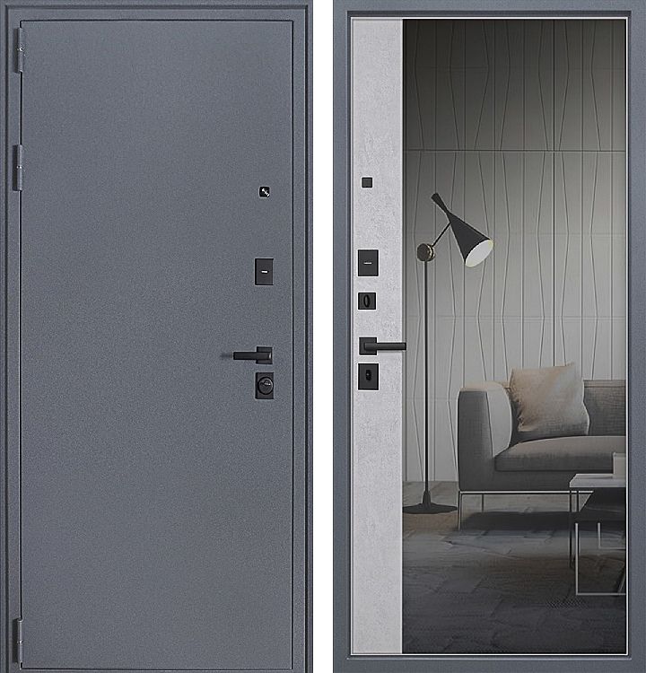 Входная дверь АСД Беркут в покрытии графит букле для установки в квартиру и дом. Эта стальная дверь с зеркалом выполнена в современном стиле Лофт, укомплектована качественными и надежными замками последних серийных разработок.