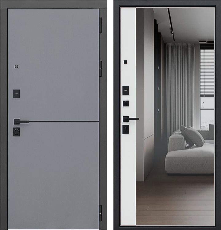 Входная дверь Бриг с большим зеркалом в покрытии муар черный для установки в квартиру. Эта трехконтурная дверь выполнена в современном стиле, укомплектована качественными и надежными замками последних серийных разработок.