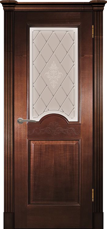 Конструкция - массив сосны с последующей отделкой натуральным шпоном ясеня. Дверное полотно со стеклом АП49 Париж орех миланский комплектуется коробкой, наличниками, доборами, капителью и карнизами - по желанию заказчика.