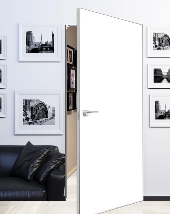 Современная дверь скрытого монтажа Invisible 700 ABS без наличников. Индивидуальное решение декорирования (покраска, под обои и другие виды отделки). Установка в одной плоскости со стеной.