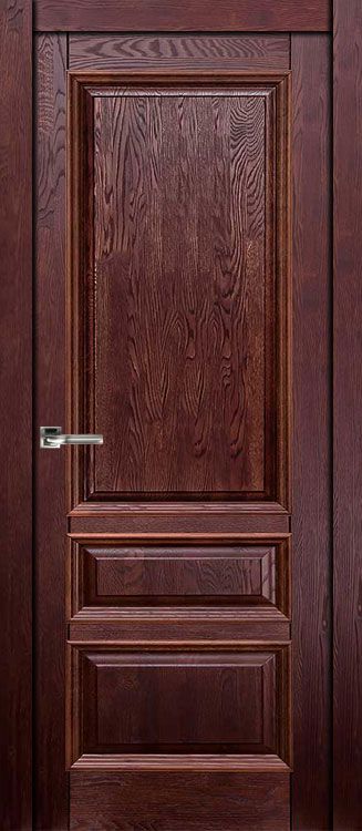 Классическая дубовая дверь Аристократ в тонированном покрытии махагон с защитным полиуретановым лаком, возможно установить дополнительный декор (Карниз, 2 розетки и 2 цоколя). За счет применения в конструкции обвязки из массива ольхи, цена на межкомнатную дверь будет меньше чем за полноценный дубовый массив.