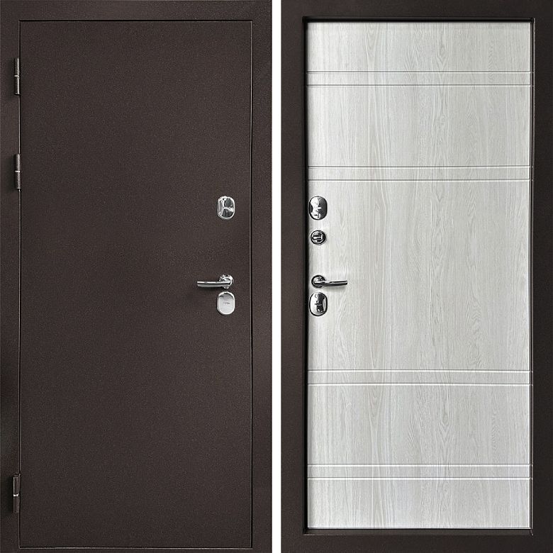 Входная дверь "Протерма" изготовлена по технологии терморазрыва дверной коробки и полотна. Внутренние и внешние металлические поверхности полотна и коробки отделены особым конструкционным термослоем черного цвета - 2-х камерный пластиковый спейсер и не соприкасаются между собой, защищая дверь от промерзания в экстремальные холода. Внешняя поверхность с полимерно-порошковым покрытием медный антик и содержанием пигментов для стойкости к ультрафиолету.