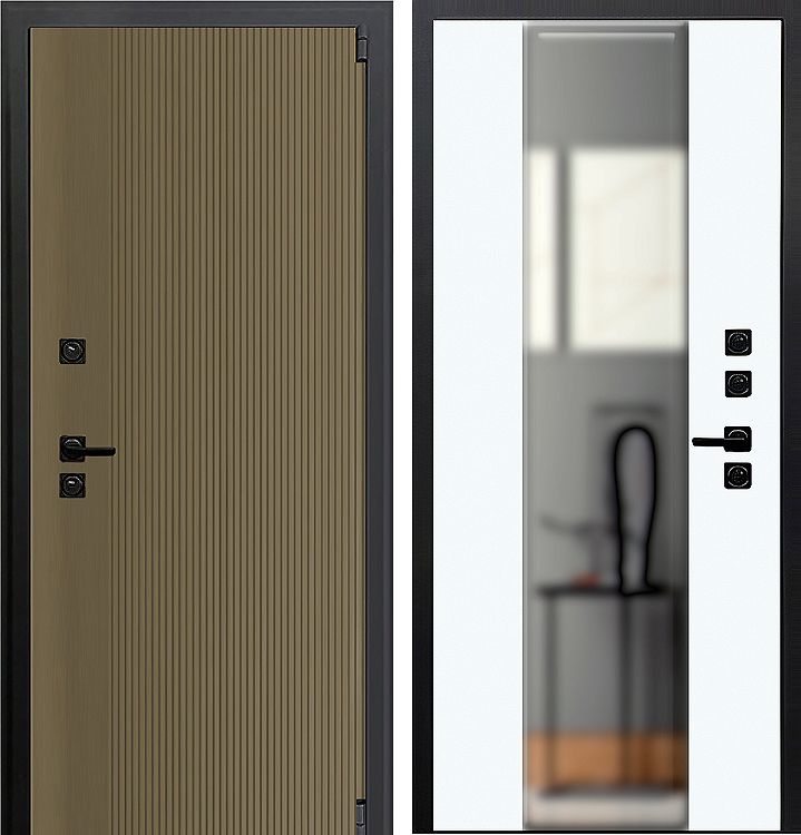 Утепленная металлическая дверь с декоративной внутренней панелью Стиль 1.1 большое зеркало белого цвета. Внешняя объемная панель Экза 17 в цвете капучино, толщина 10мм.