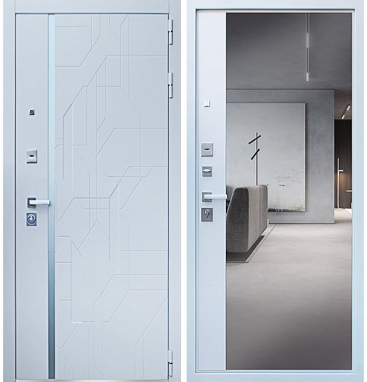 Входная дверь в квартиру Эверест с внешней белой отделкой с большим внутренним зеркалом.