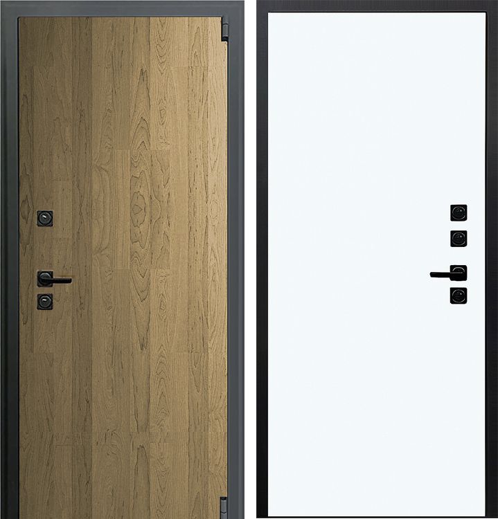 Утепленная металлическая дверь с декоративной внутренней панелью М1 белого цвета. Внешняя панель Модерн шпон дуб кантри в цвете какао, толщина 12мм.