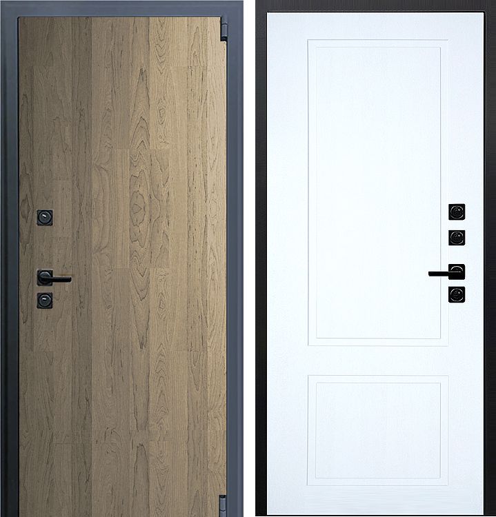 Утепленная металлическая дверь с декоративной внутренней панелью НЕО 2 белый софт. Внешняя накладка-панель Модерн шпон дуб кантри в цвете какао, толщина 10мм.