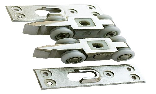 Монтажная пластина соединяет ролик и дверное полотно, изготовлена из стали и крепится к дверному полотну. Колеса ролика производятся из износостойкого пластика, материал является бесшумным. В каждом колесе установлен шариковый подшипник. Колеса ролика заводятся в верхнюю направляющую (2 или 3 метровую) и двигаются по ней. Ролики поставляются комплектом из 2 шт - для подвеса или одной раздвижной двери весом до 50 кг. Стопора устанавливаются в верхнюю направляющую и служат ограничителями движения полотна в ту и другую сторону.
