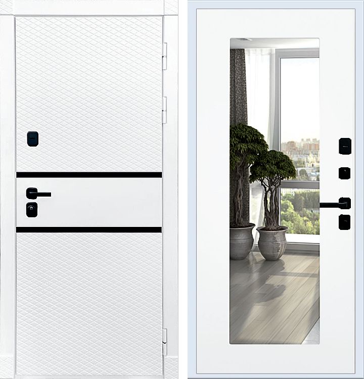 Утепленная входная дверь в квартиру Rx15 белого цвета. Трехконтурная дверь с внешней стороны панель толщиной 16мм с черными вставками и выбором внутренней панели под свой интерьер прихожей.