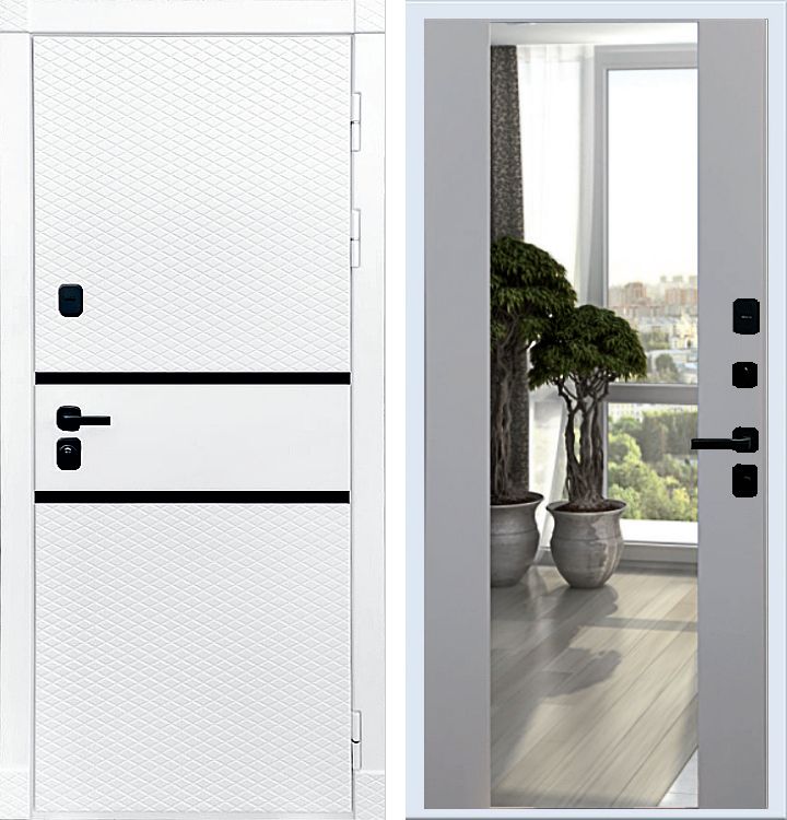 Теплая входная дверь в квартиру Rx15 белого цвета. Трехконтурная дверь с внешней стороны панель толщиной 16мм с 2 черными горизонтальными вставками и выбором внутренней панели под свой интерьер прихожей.
