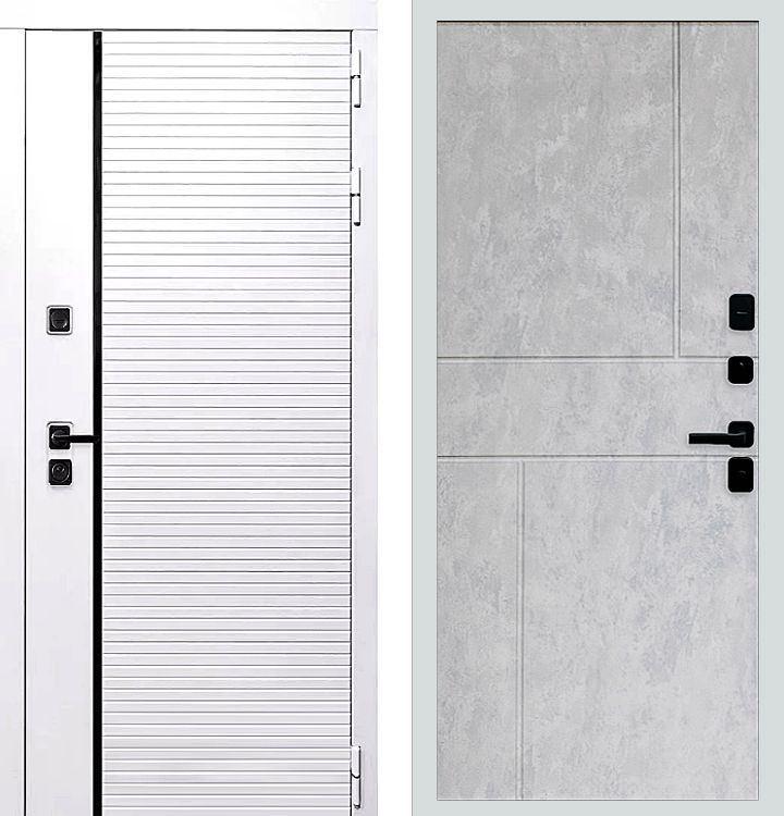 Входная утепленная дверь Rx29 белого цвета для установки в дома ПИК. Белая металлическая дверь с внешней стороны стандартная панель с черным молдингом и выбором внутренней панели под свой интерьер прихожей.