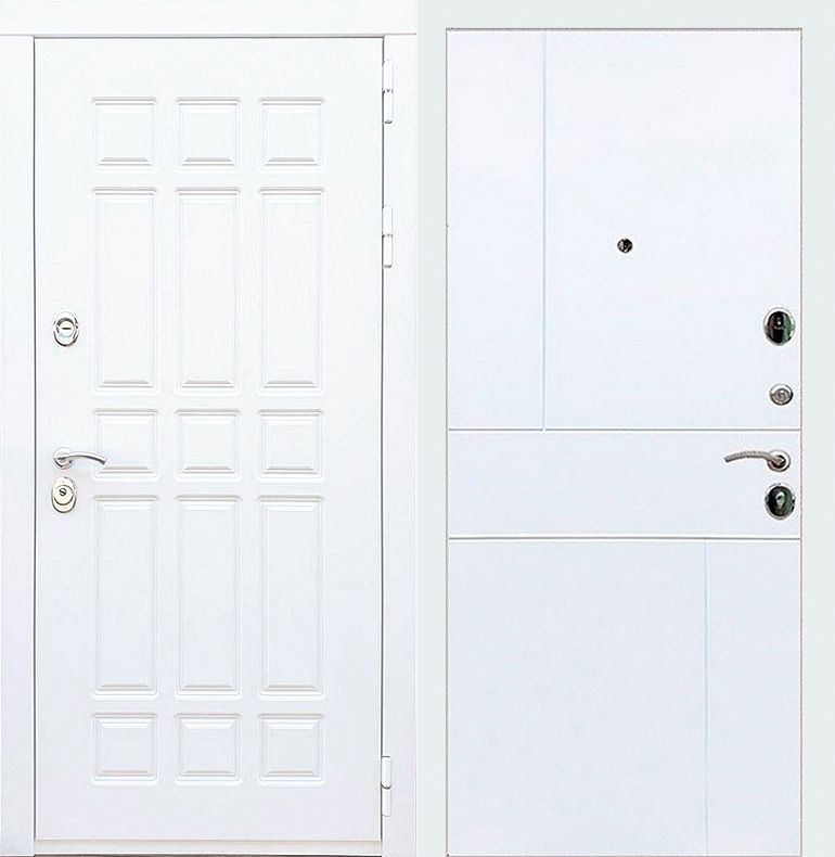 Входная утепленная дверь Rx8 белого цвета для установки в дома ПИК. Белая дверь с внешней стороны панель ФЛ 33 и выбором внутренней панели под свой интерьер прихожей.