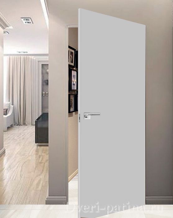 Современная дверь скрытого монтажа Invisible Standart без наличников. Индивидуальное решение декорирования (покраска, под обои и другие виды отделки). Установка в одной плоскости со стеной.