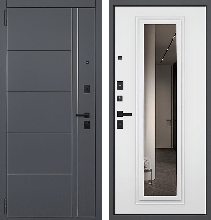 Входная дверь Вегас в покрытии серый муар с двумя панелями для установки в квартиру. Эта стальная дверь выполнена в современном дизайне, укомплектована качественными и надежными замками последних серийных разработок.
