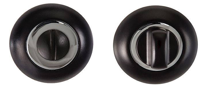 Завертка выполнена в стилистике дверных ручек, имеет тот же цвет, аналогичную форму розетки и снабжена удобным поворотным вертушком.